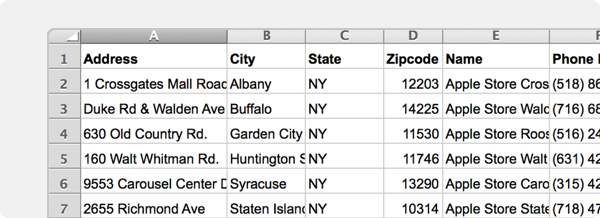 From spreadsheets, to tables in web pages, databases—anywhere you can visualize a table with location data you can paste it into BatchGeo. If you are starting from scratch, we recommend using our Spreadsheet Template to get started with your data, then simply copy the data over to BatchGeo to create a pin map.